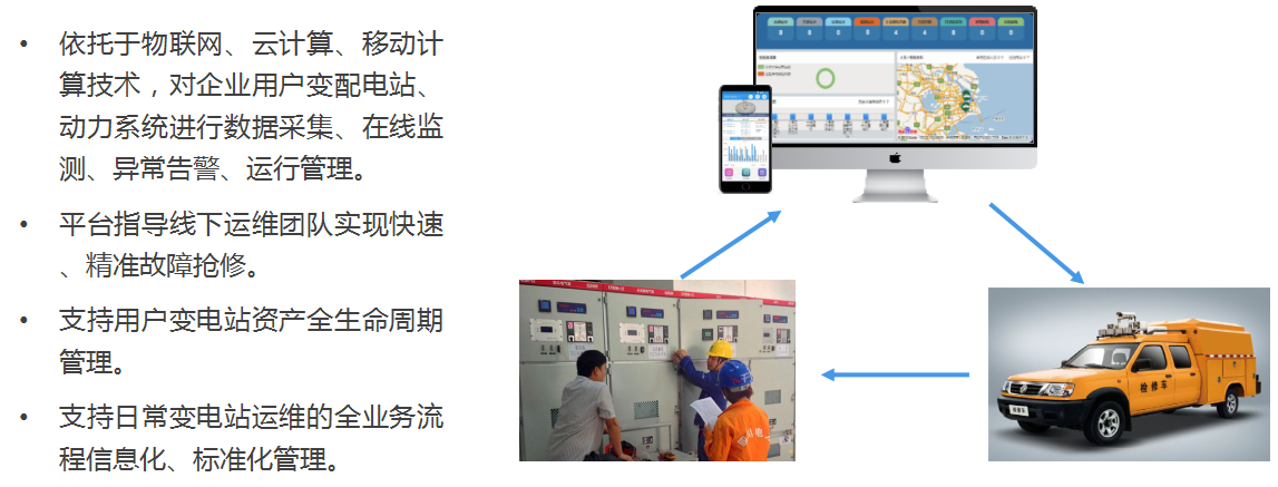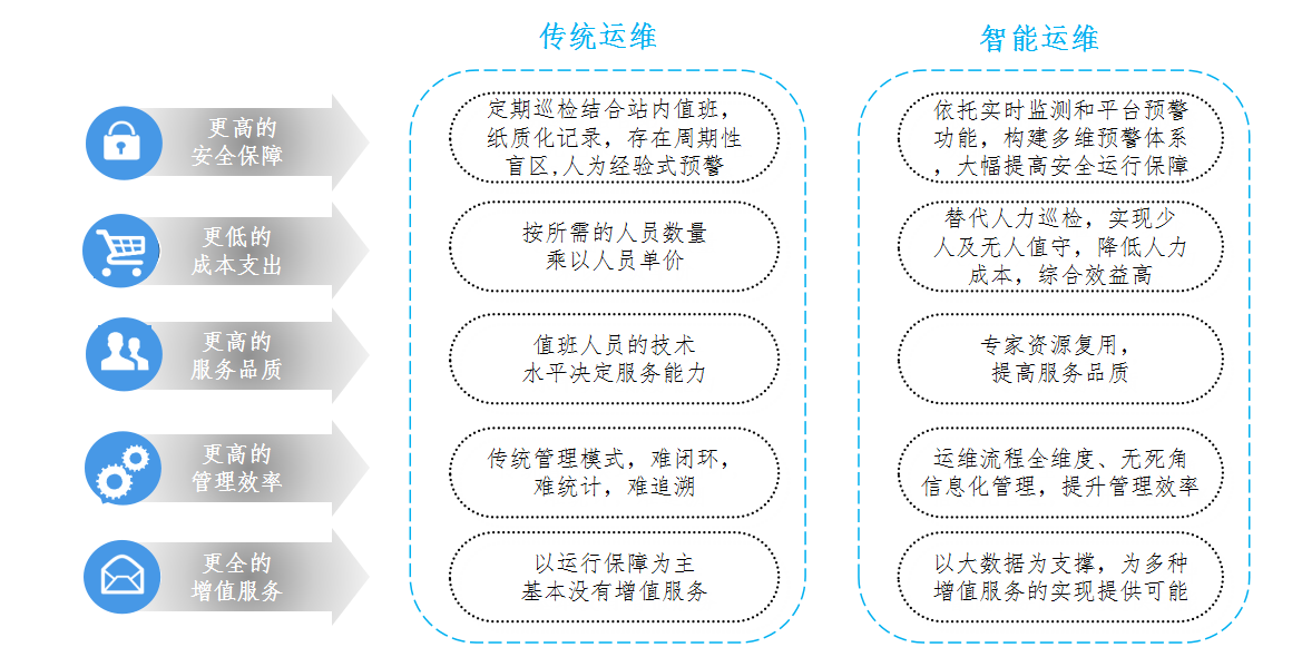 “智能运维”也叫“智能电力运维服务”,是传统电力运维结合“互联网+”技术以及共享思维而产生的新型电力管理模式,通过线上平台+线下运维团队+APP,构建新的运维服务支撑体系,有效提升变电站运行的安全、效率和经济性。